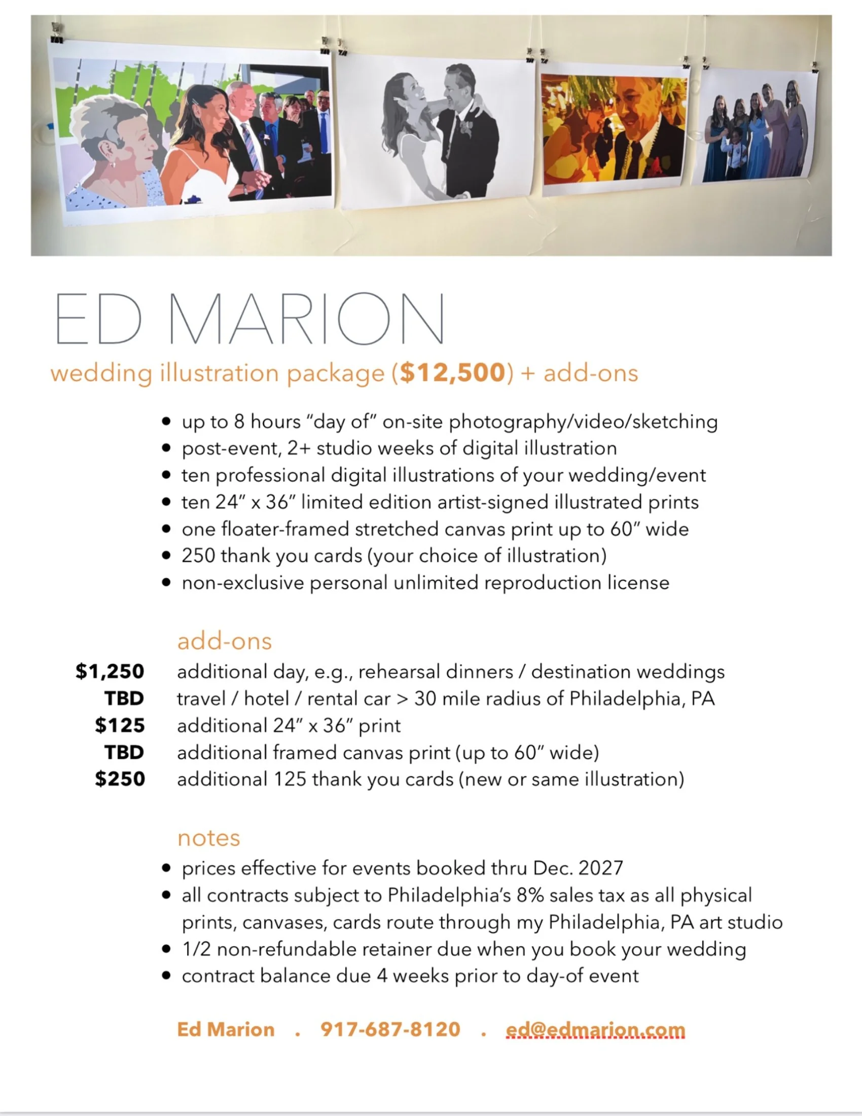 My package for “day of” digital illustrating (up to 8 hrs.) and 2+ weeks of studio illustration starts at $12,500. This package includes 250 thank you cards, ten (10) signed limited edition prints (up to 24” x 36”), and one signed floater-framed canvas (up to 40” x 60”). Additional cards, prints and canvases are available a la carte.